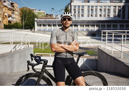 Athletic bicyclist in sportswear resting on bike after training workout