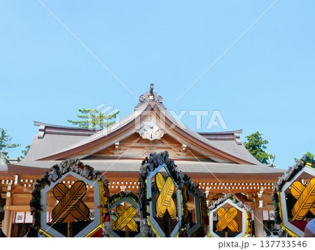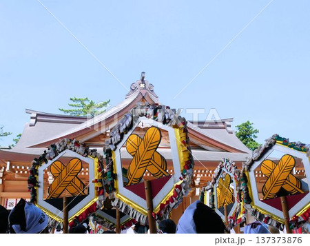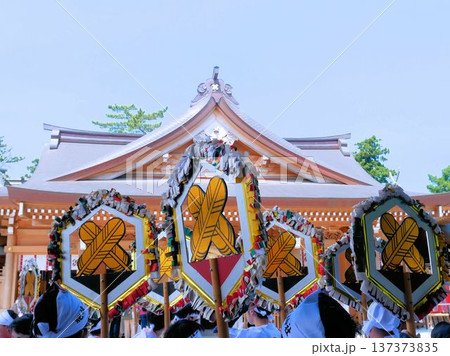 おんだまつりの風景 阿蘇神社の神紋の『違い鷹』(熊本県阿蘇市)