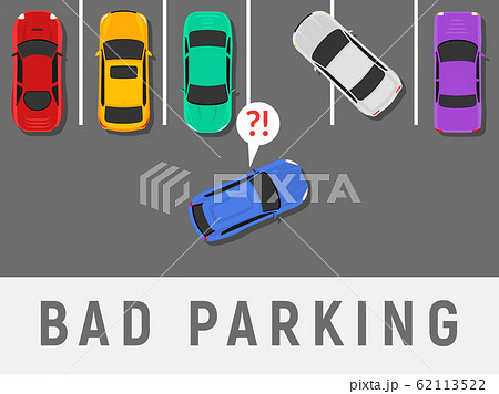 Bad, improper parking of car in parking lot, top view. Traffic rules in city. Colored automobiles. Urban scene. Wrong parked transport. Cartoon flat style isolated illustration. Vector concept