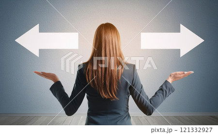 Rear view doubtful businesswoman in a suit balancing hands as stands in front wall with arrows pointing two different directions. Difficult business choice between left and right sides