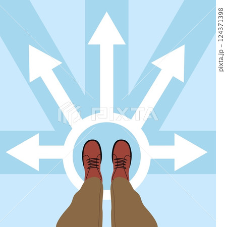 Person is faced with choice of direction. Man chooses path. Alternative opposite roads. Businessman legs top view making difficult decision. Cartoon flat style isolated vector concept