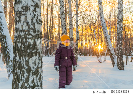 a girl in a warm jumpsuit walks through winter snow-covered forest