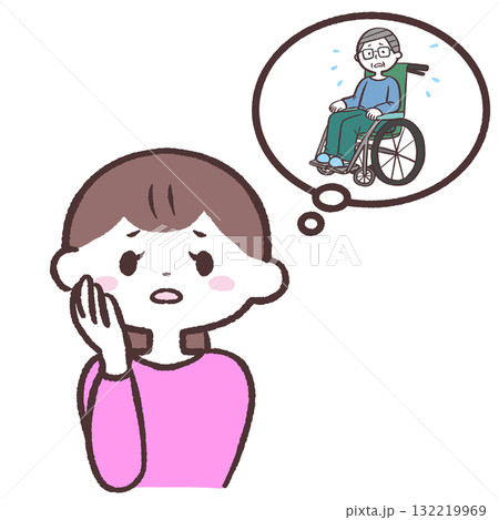車イスのシニア男性を心配する女性のイラスト
