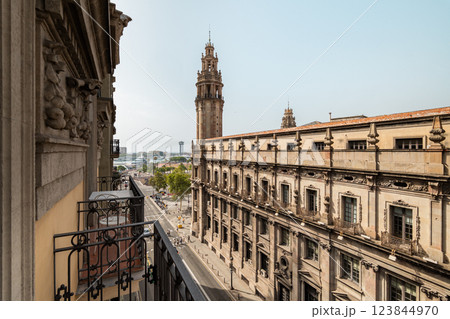 Elegant balcony view overlooking a grand neoclassical building with an ornate tower in Barcelona, Spain.