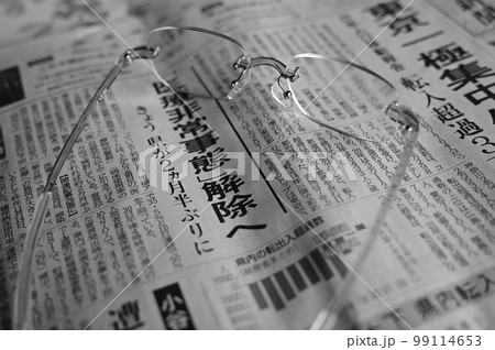 老眼鏡を掛けて英字新聞を読むミドル女性