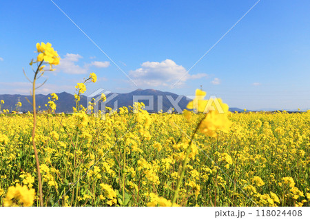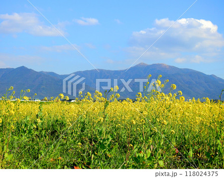 福岡県直方市遠賀川河川敷の菜の花と青空と福知山山並み