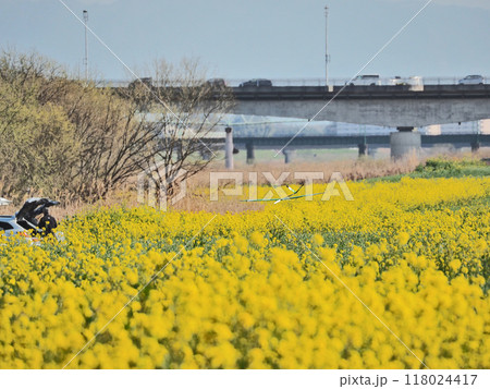 菜の花咲く河川敷でグライダーを飛ばす光景