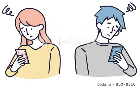 スマホを見て悩んでいる男女 遠距離恋愛 シンプルイラスト