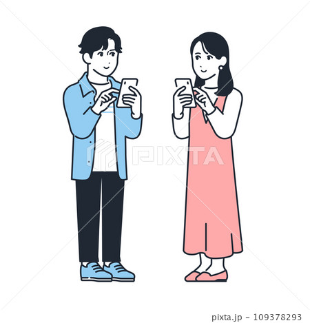 スマートフォンを操作する若い男女のシンプルなベクターイラストセット素材