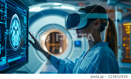 未来的なクリニックで大きなホログラフィックスクリーンに映る情報を見ている