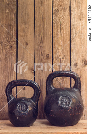 Pair of two old heavy iron kettlebells