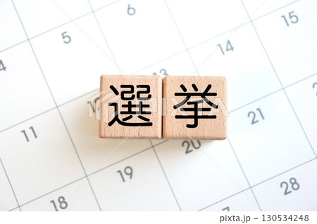 カレンダーの上に置かれた木製ブロックの選挙の文字。投票日程のイメージ。