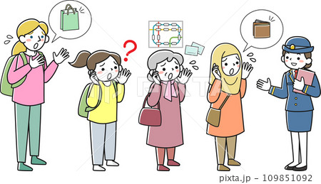 駅で困っている人々と女性駅員のセット