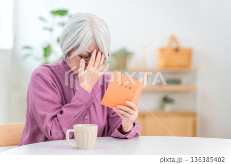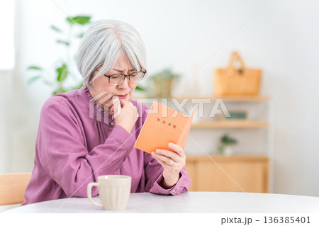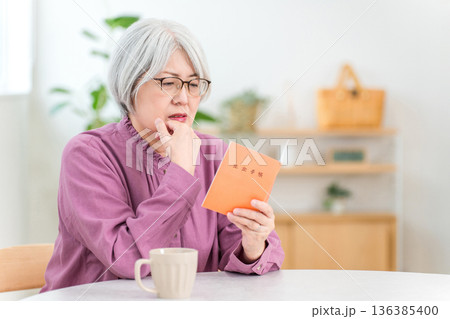 家で年金手帳を見ながら困る,悩むシニア女性