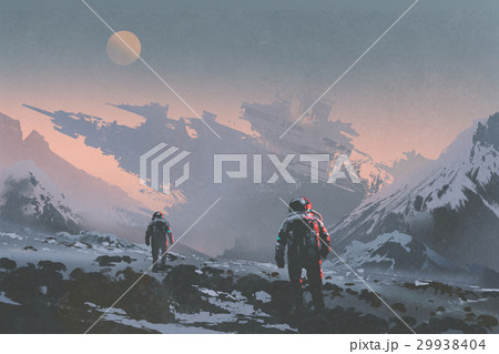 astronauts walking to derelict spaceship
