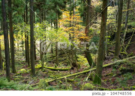 那岐山への登山道脇のヒノキ林と紅葉 岡山県勝田郡奈義町