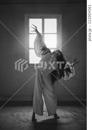 Exorcism. Monochrome creepy image of woman with black hair, in white gown with long claws stands barefoot in a creepy empty room