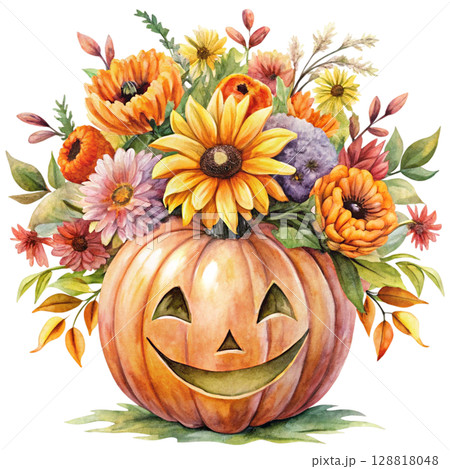 Watercolor illustration of a smiling jack-o-lantern pumpkin surrounded flower