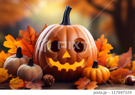 An eerie carved pumpkin with a spooky face smiles, glowing in the autumn light on a rustic wooden table