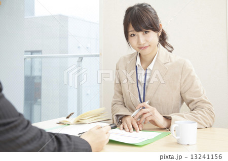 ビジネスシーン 会議室でグラフ資料を見せる女性 男女