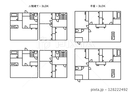 二階建て住宅と平屋の3LDKの間取りをイメージしたアイコンセット