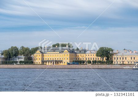 Beautiful view of historic yellow building along the Neva River in Saint Petersburg during a clear day