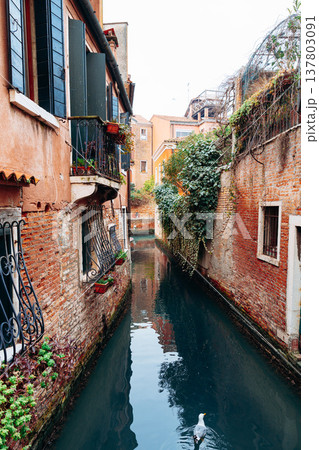 Waterway flows between old buildings in Venice with a duck swimming on the surface