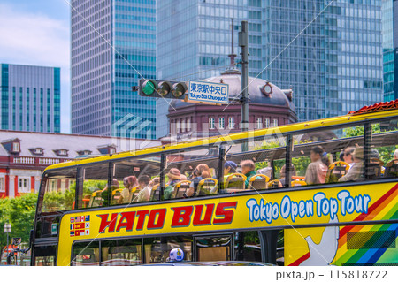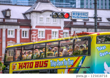 日本の東京都市景観 インバウンド復活(賑わう東京駅前)。東京駅中央口や外国人観光客らが搭乗中のバス