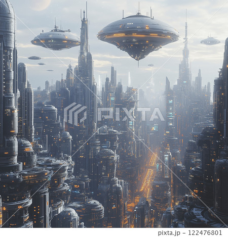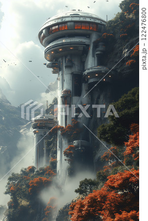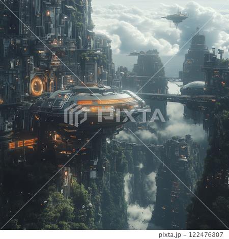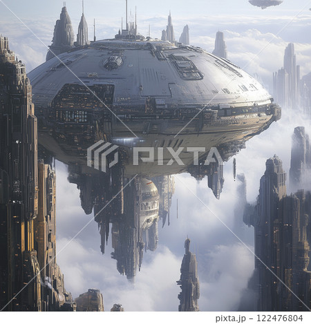 霧と雲に浮かぶSF未来都市の風景「AI生成画像」