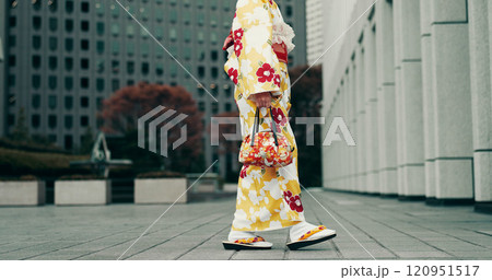 Feet, walking and woman in city with kimono, morning commute and sightseeing in traditional clothes. Explore, discover and girl with Japanese fashion, sandals and urban culture on travel adventure
