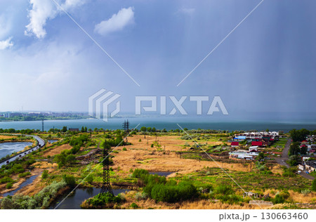 Heavy rainfall over countryside near lake