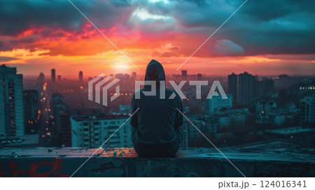 Hooded Individual Watching Vibrant Urban Sunset Over the City Skyline