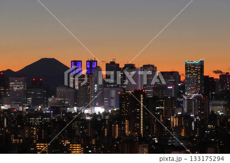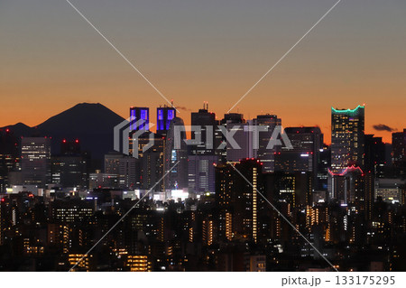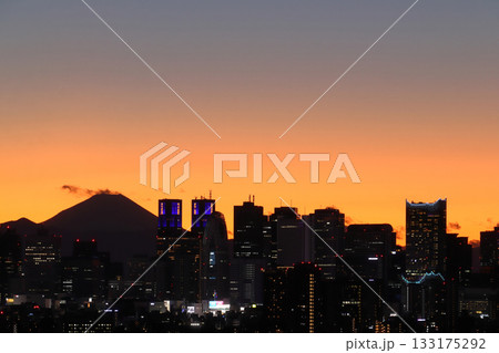 冬晴れ:夕日の新宿高層ビル群と富士山