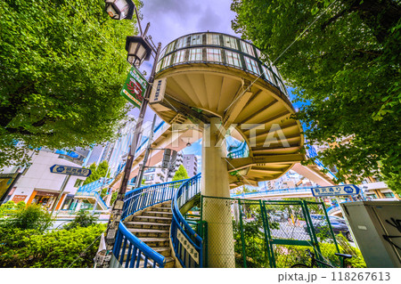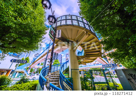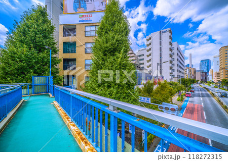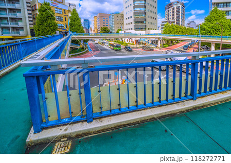 日本の東京都市景観 歩道橋のある街。渋谷橋歩道橋。明治通りや駒沢通り(起点)などを望む。四角形…