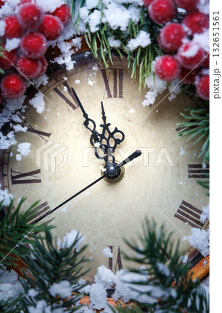 Oldfashioned clock with holiday decorations, Antique clock amidst winter holiday ornaments