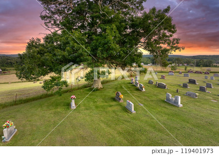 Church graveyard with many tombstones in small American town. Burial place on churchyard green grass
