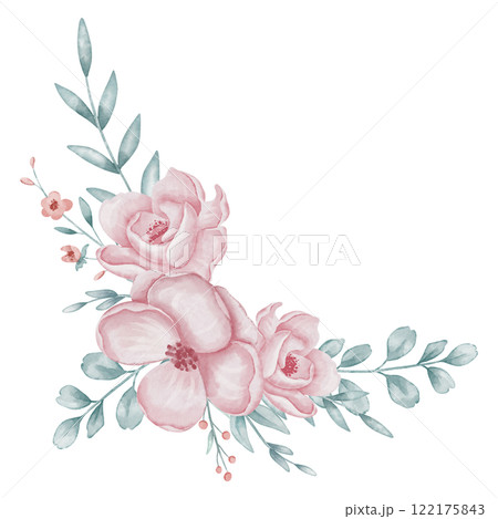 Watercolor Floral corner composition with pink Flowers and green leaves. Illustration for wedding invitations, greeting cards. botanical drawing in soft pastel colors for baby shower design.