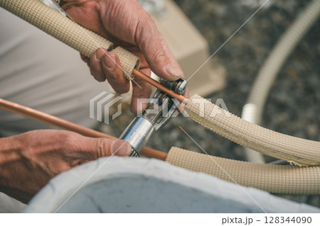 冷媒管をパイプカッターでカットする作業員男性手元 エアコン取り付け工事
