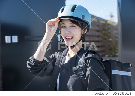 フードデリバリーイメージ スマホを持ってヘルメットを被った配達員女性