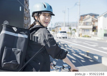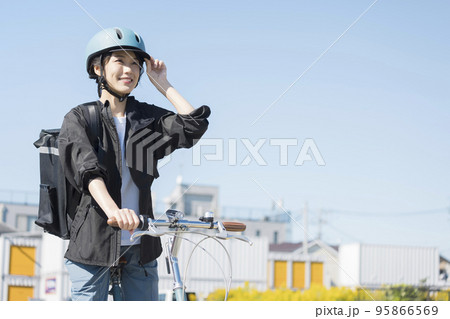 フードデリバリーイメージ 自転車でデリバリーする若い女性配達員