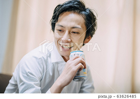 家の寝室で晩酌する若いアジア人女性(ビール,家飲み,飲酒習慣)