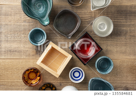 枡やぐい呑みなどの酒器が散りばめられた和の雰囲気の木製テーブル背景の俯瞰