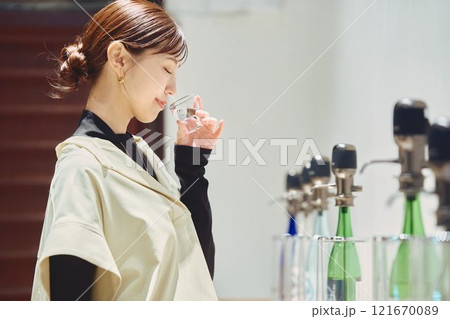 お店でお酒を選ぶ女性 撮影協力・今代司酒造