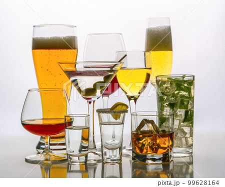 A diverse assortment of alcoholic beverages on a white background in a counter light
