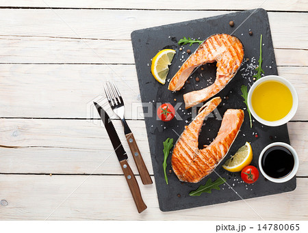 Grilled salmon, salad and condiments