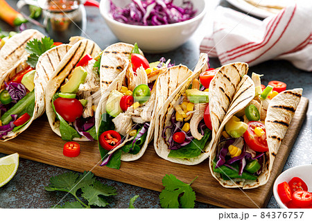 Chicken tacos with grilled meat, avocado, fresh vegetable salad and sauce salsa