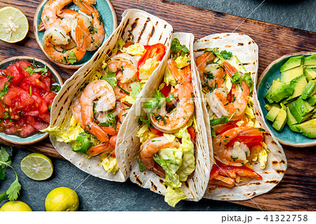 Shrimps tacos with salsa, vegetables and avocado. Mexican food