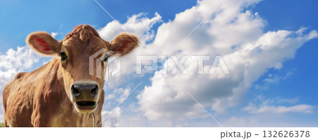 Panoramic view of brown cow with cute eyes against blue sky with clouds, close-up, looking at camera. Banner. High quality photo