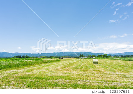 牧草畑の乾燥と干し草のロールの風景と背景素材、牧草ロール
