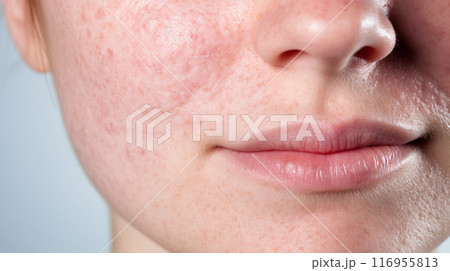 顔のニキビ跡がひどい女性の肌のクローズアップ